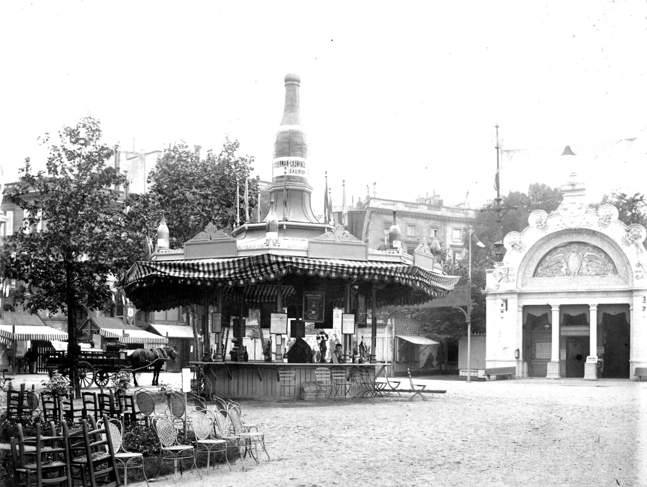 Le kiosque contemporain s’inspire d’une photographie de 1895. Pour la XIIIème Exposition industrielle de Bordeaux, la Maison avait installé sur la place des Quinconces, un édifice de plan octogonal, en charpente bois et surmonté d’une gigantesque bouteille factice et d’autres, plus petites, situées aux angles du toit. Pour sa nouvelle interprétation, le kiosque conserve une charpente en bois. Quant aux bouteilles, elles servent de matériau de construction : 4230 tuiles de verre, soit 2115 bouteilles de 75cl fendues en deux dans le sens de la longueur et fixées à la charpente assurent la couverture de l’ouvrage. Elles font ruisseler l’eau de pluie de goulot en goulot, tout en laissant filtrer le soleil. L’installation sera éphémère : son exposition est programmée pour une durée de cinq saisons et pourra servir aux performances, concerts et dégustations. C’est ainsi qu’elle a été conçue par ses créateurs, comme nous l’explique Nicolas Barreau : « Jules Charbonnet et moi sommes designers de formation. Aussi, dans nos projets, la question de l’usage est toujours prépondérante. « Le coup de folie » est une installation qui peut autant se regarder qu’être investie : c’est clairement un kiosque, à l’image de ceux qui jalonnent l’histoire de l’architecture de nos parcs et de nos jardins, un lieu où l’on vient flâner ou se retrancher. »